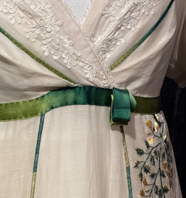A dress worn by Helena Bonham-Carter in the film “Room with a View” is among dozens of stunning and intricate costumes on display for one more week at an exhibition in London.